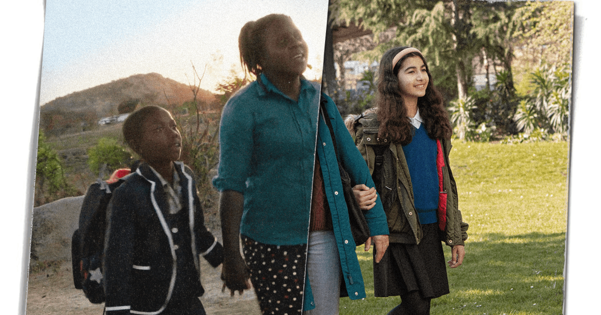 Girls holding hands walking to school